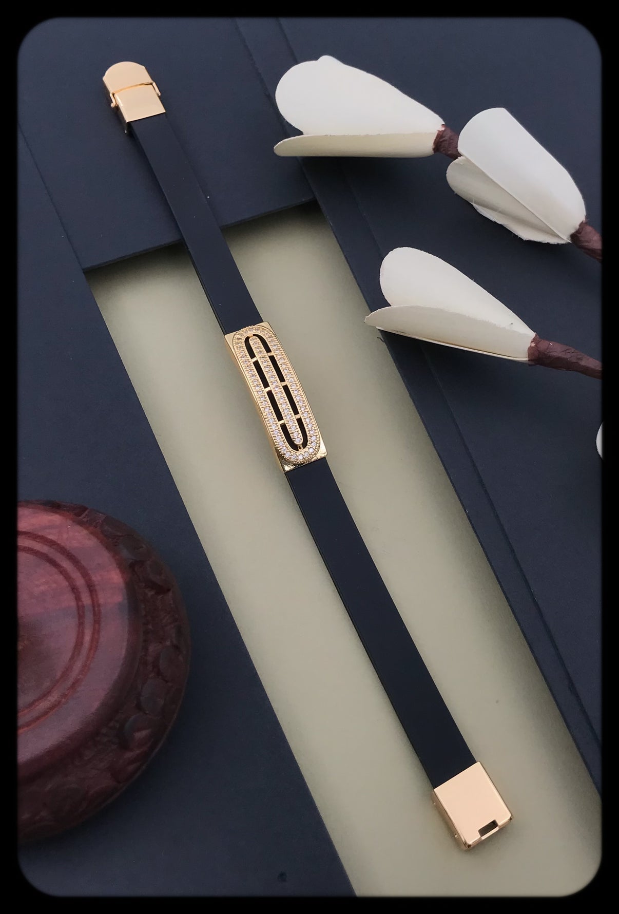Elevate your style with this rose gold-plated leather bracelet for men. Featuring a sleek black strap, geometric CZ detailing, and adjustable hook closure, it’s perfect for casual or formal occasions.