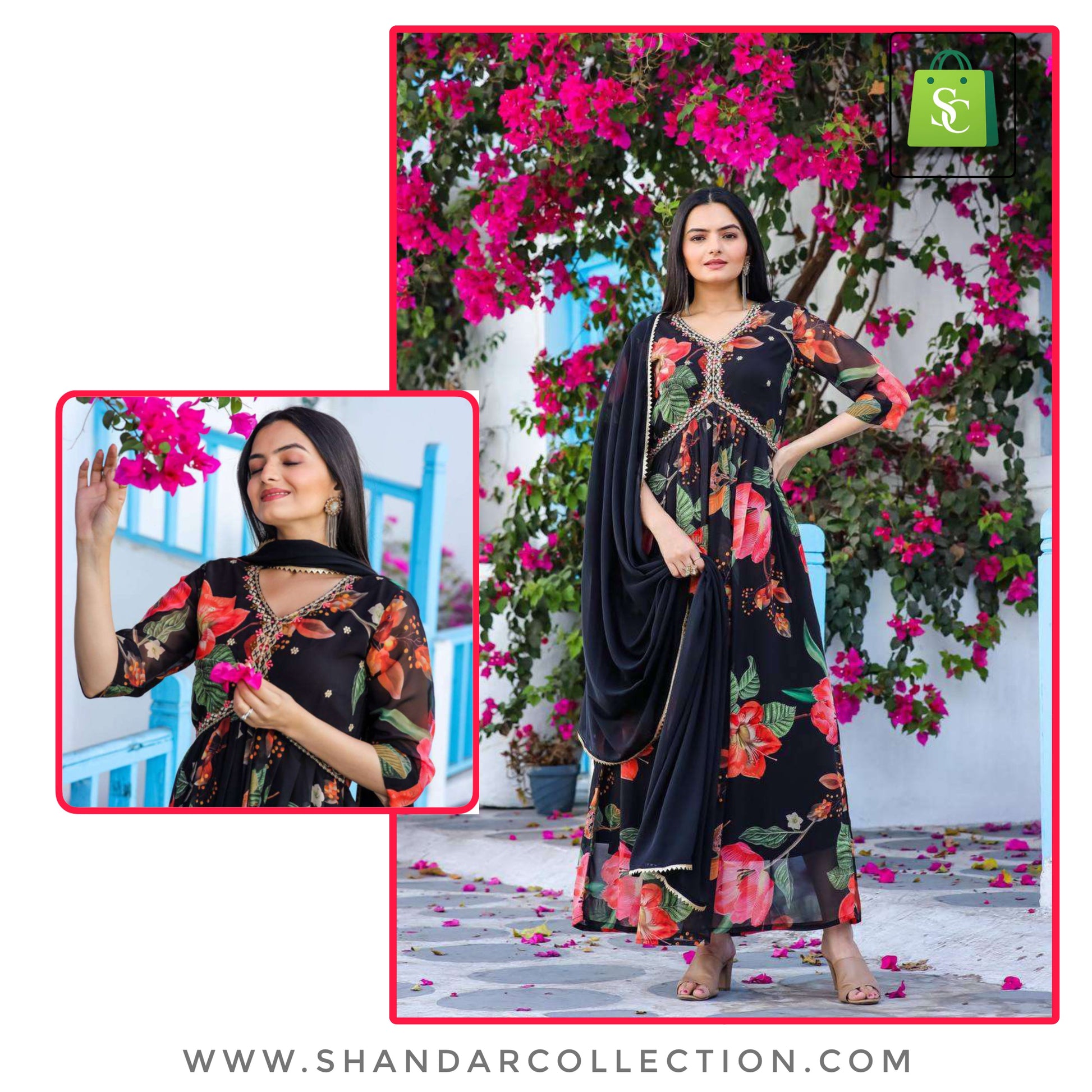 Featuring soothing yet georgette Fabric with sequence embroidery work and full lining with dupatta with work lace elegant work Anarkali gown with Color .GOWN style and pattern. It is a perfect outfit for any small gathering or function. It is very comfortable as it looks