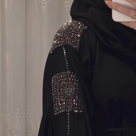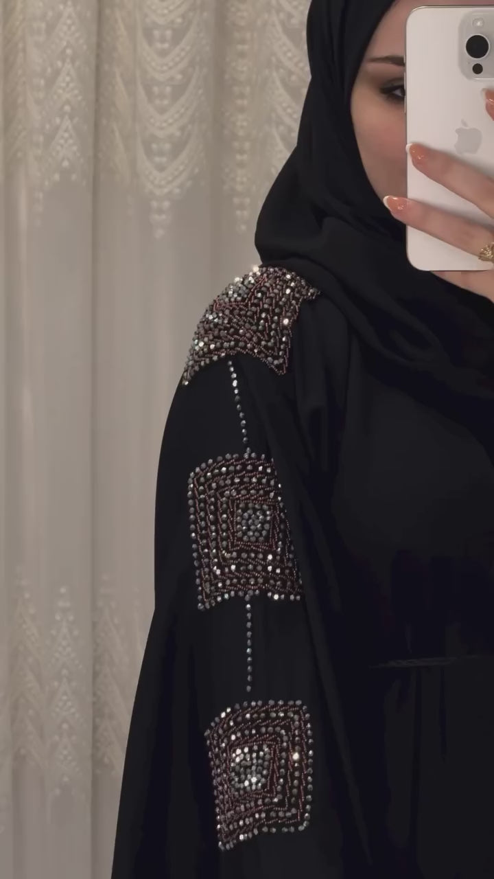 Handwork abaya with full umbrella sleevs pattern With black hijab front open with buttons MPORTED NIDA Available size 54, 56