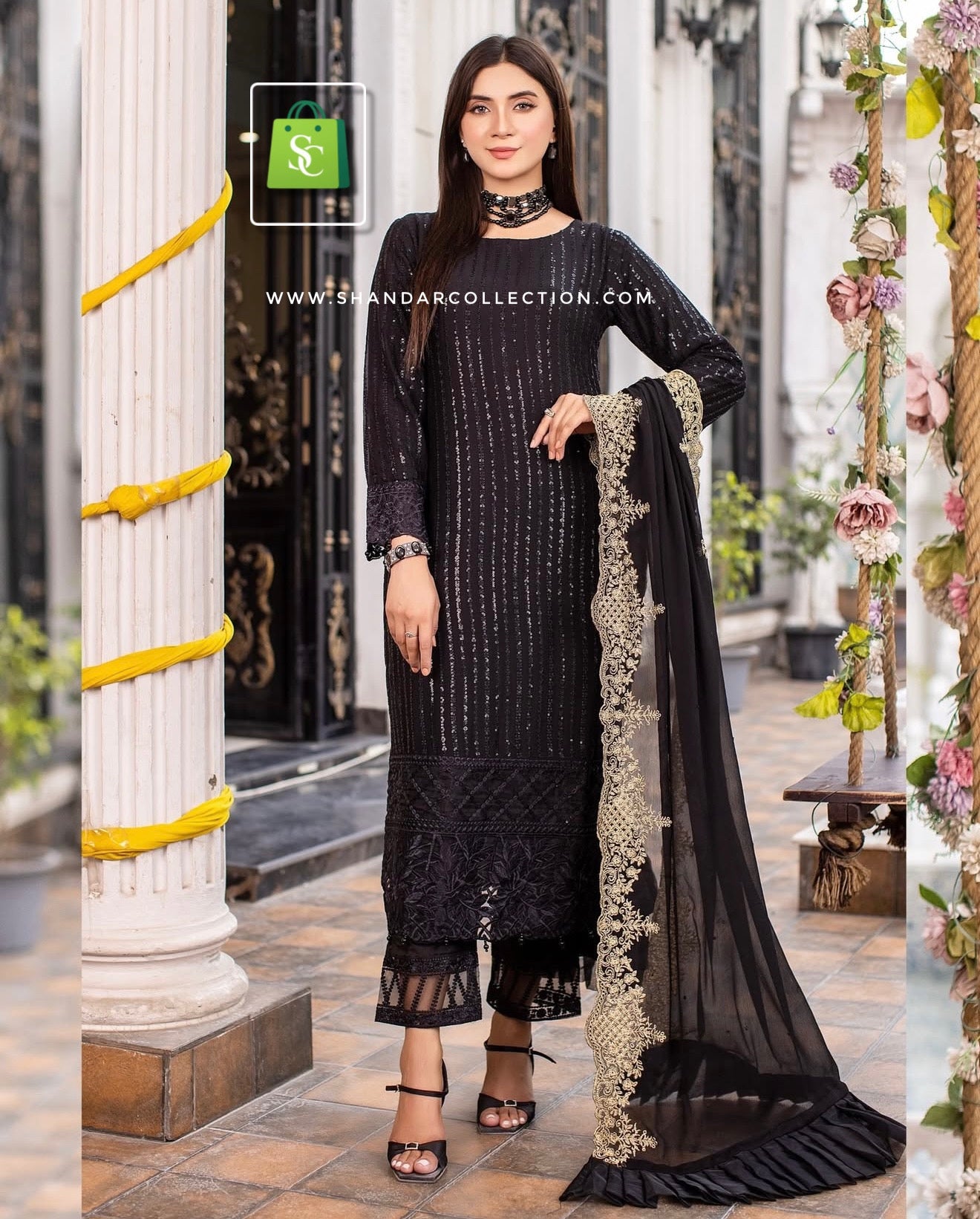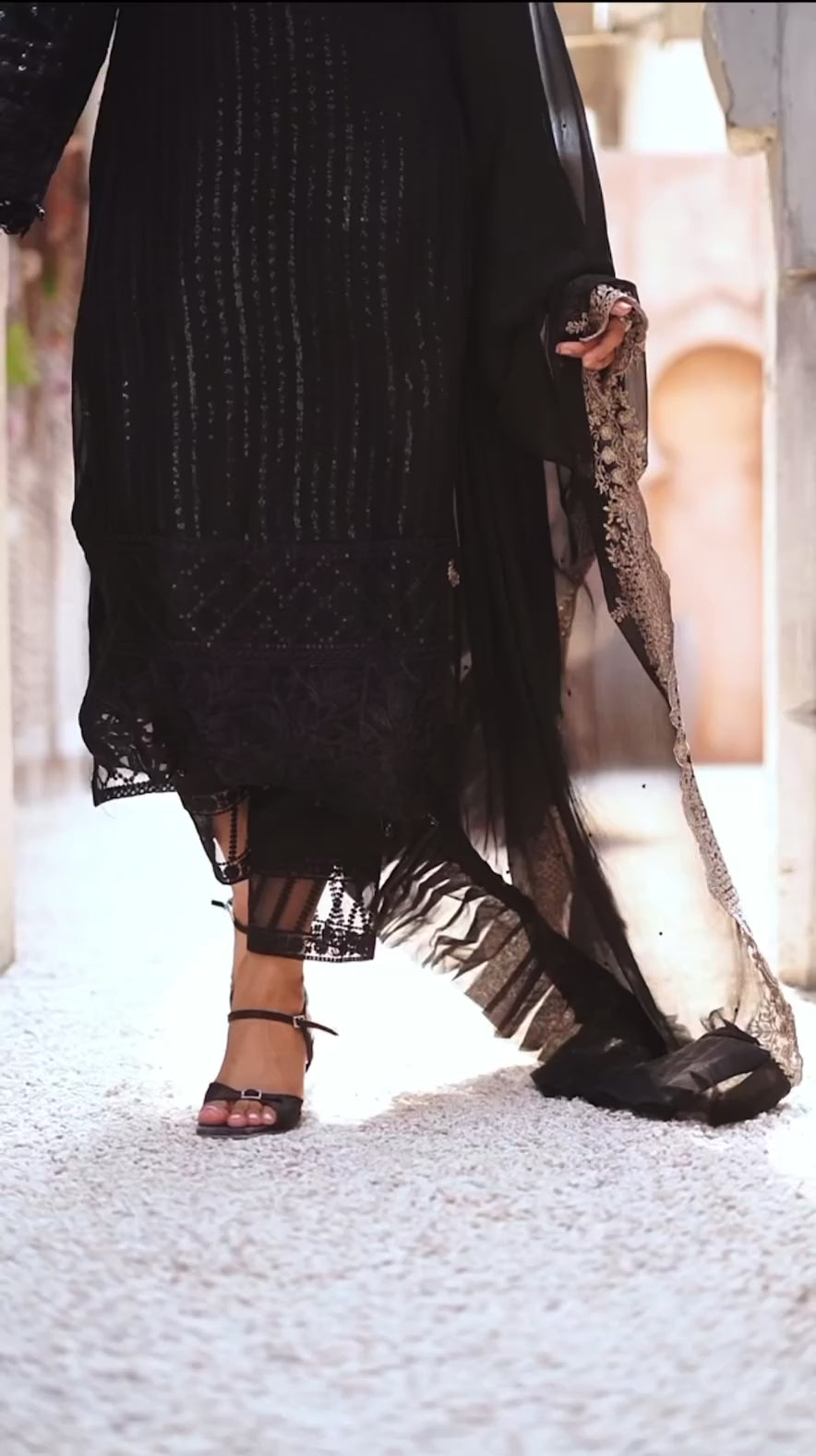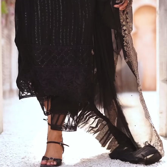 Offering you a divine luxury and essence of festivity with this special readymade formal dress. The black and gold combination of this dress provides celestial charm. The use of intricate threadwork and embellishments redefines traditional fashion wear. Tissue patch on sleeves and hemline with tassels infuse charm. Moreover, the raw silk trousers with tissue patches and embroidered chiffondupatta with frill design on the borders offer contemporary glory.