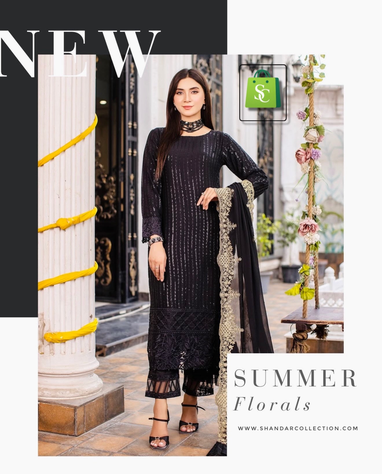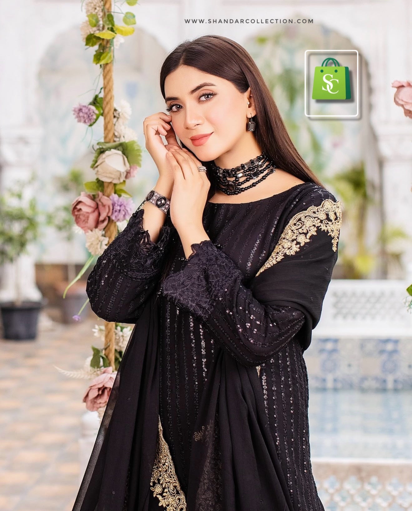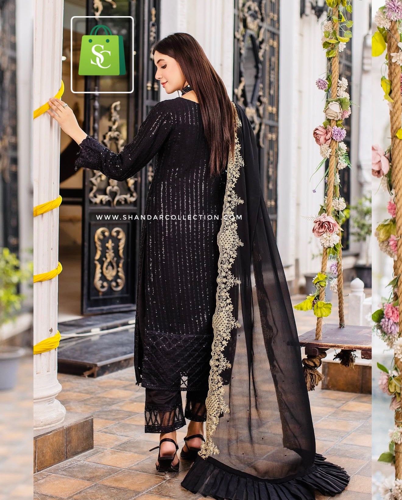 Offering you a divine luxury and essence of festivity with this special readymade formal dress. The black and gold combination of this dress provides celestial charm. The use of intricate threadwork and embellishments redefines traditional fashion wear. Tissue patch on sleeves and hemline with tassels infuse charm. Moreover, the raw silk trousers with tissue patches and embroidered chiffondupatta with frill design on the borders offer contemporary glory.
