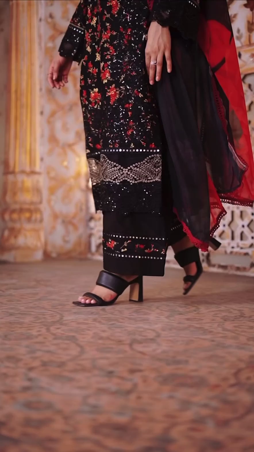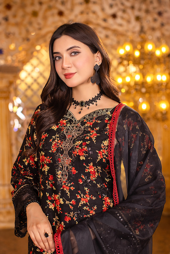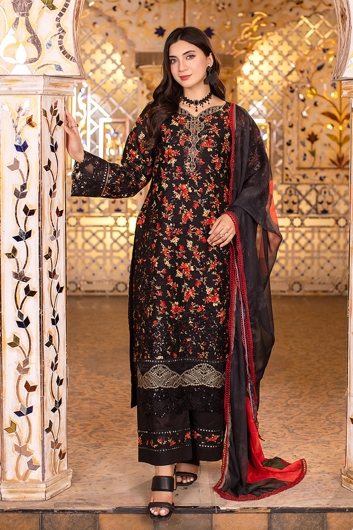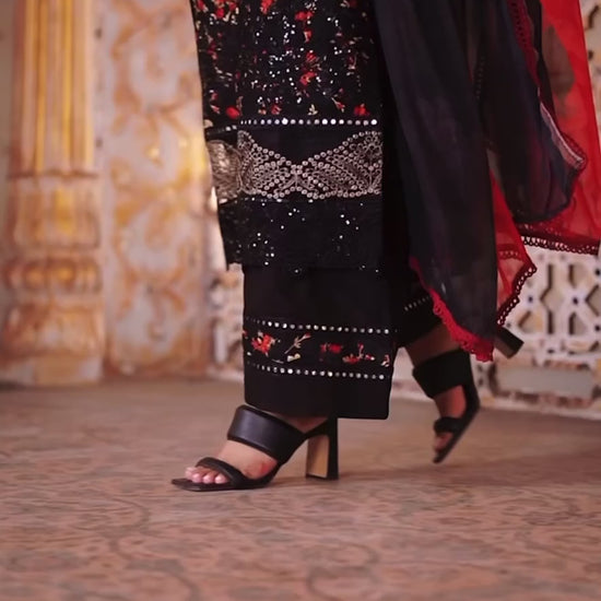 Infused in hues of black featuring meticuluous embroidery layered over front and back, paired with plain bottoms and adorned chiffon dupata.