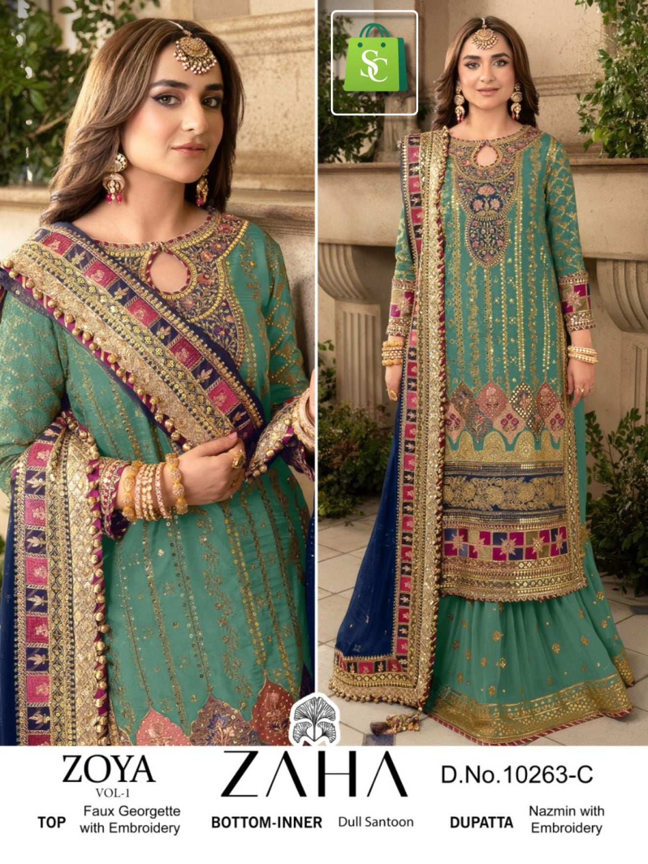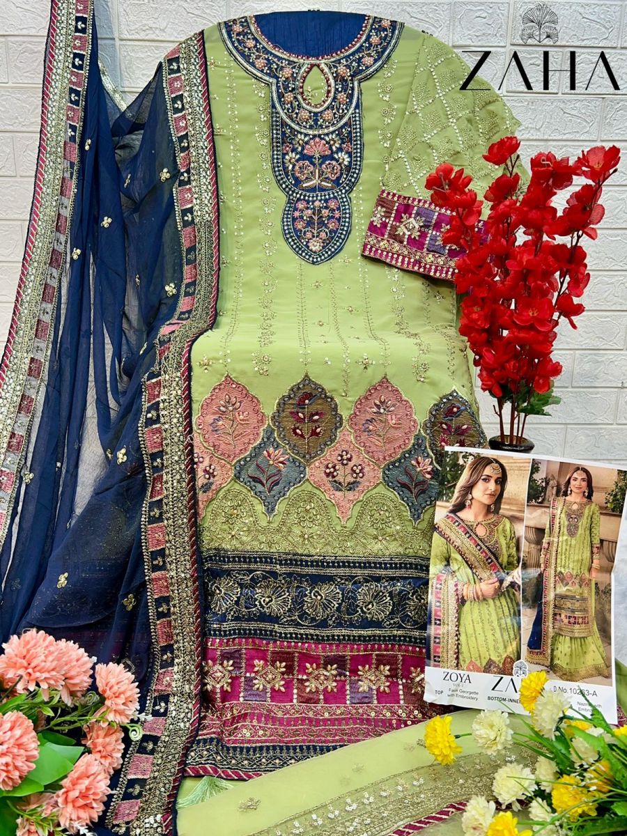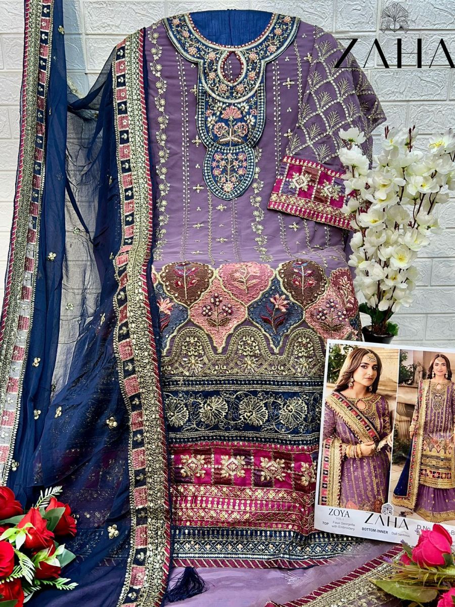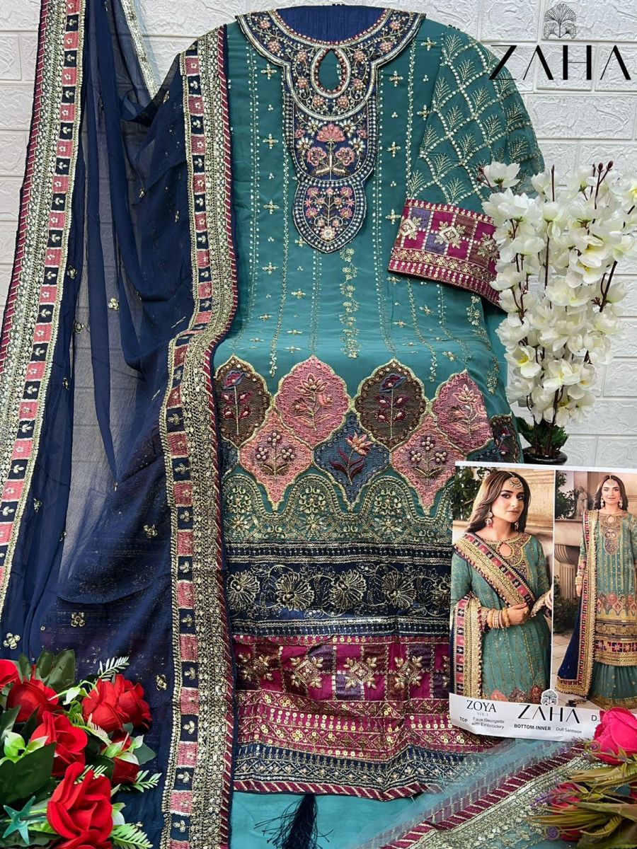 | FABRIC DETAILS | Top : FOX JORGET WITH HEAVY EMBROIDERY WITH MOTHI Bottom :DULL SANTOON WITH HEVAY EMBROIDERY Dupatta : NAZMIN WITH HEAVY EMBROIDERED |